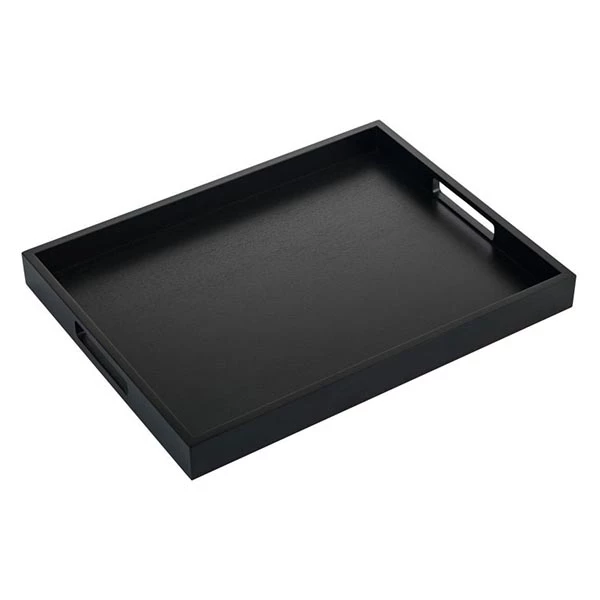 A black wood finish tray with a durable sapele wood construction with a lacquered finish for ease of cleaning.
