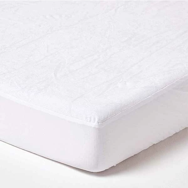 Cot size towelling waterproof mattress protector. Wonderfully soft absorbent terry towelling with breathable waterproof PVC backing, protects mattress against liquid spills and soiling.