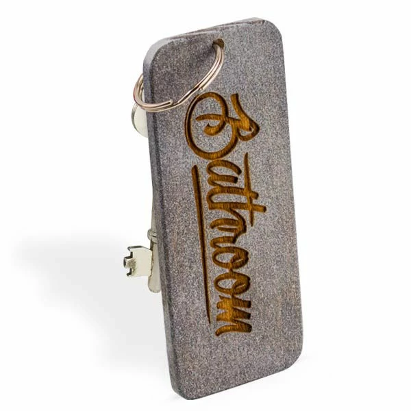 A stylish engraved grey wood key tag with a unique smooth finish. 127mm x 50mm rectangle with either gold or silver ring fixings.