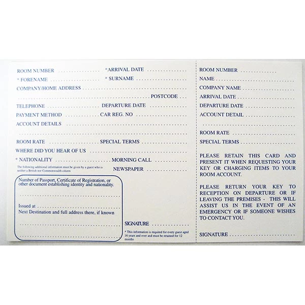 Guest registration card with tear-off key card. Pre-printed hotel guest registration forms to record all the statutory information required when a guest registers into a hotel By law all guests over the age of 16 must complete a registration form or card