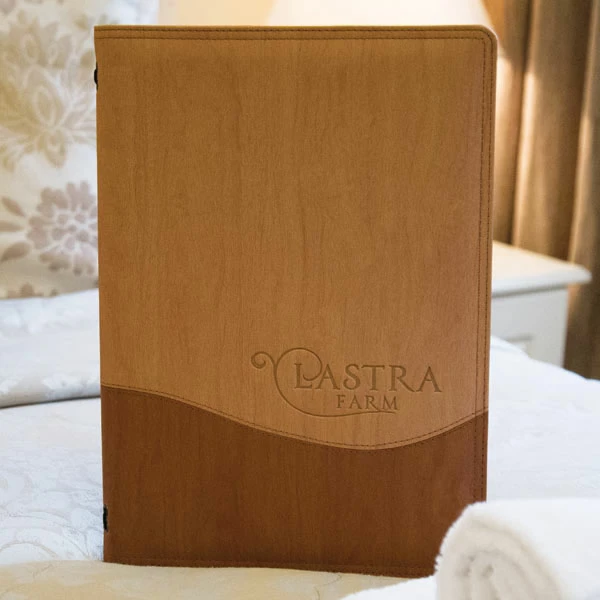 Personalise the front cover with heat embossing and add interior options to suit your establishment. Plastic pockets are held in using our versatile tagged cord fixing. Built in pockets inside the front and back cover can be added for extra storage.