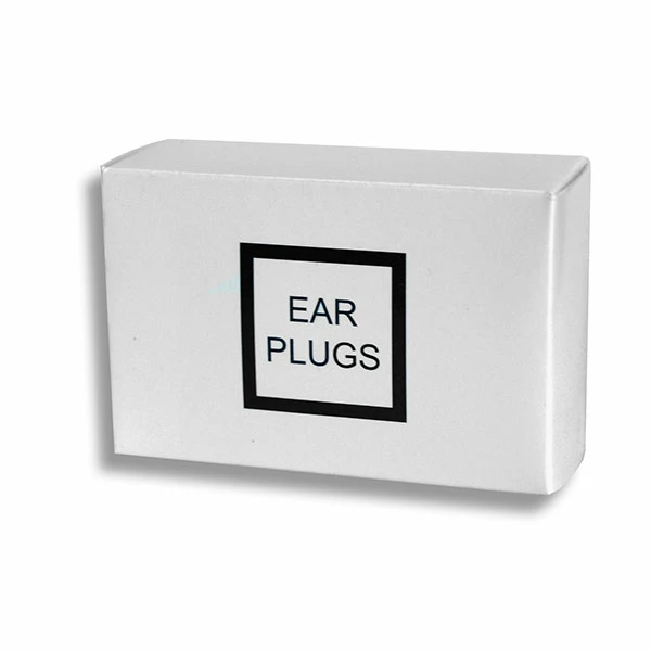 A pair of ear plugs hygienically wrapped in ts own white cardboard box. Ear plugs are designed to be inserted in the ear canal to protect the user’s ear from the effects of loud noises.