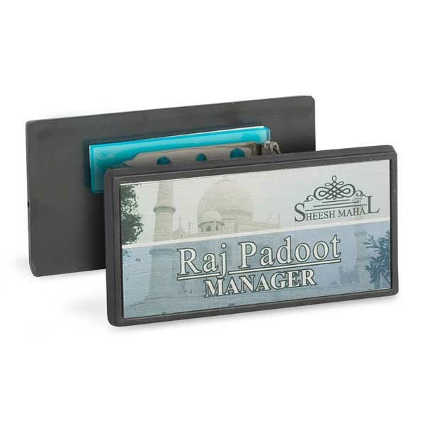 This personalised badge comes as a clip name badge with pin as standard, but is also available with a magnetic badge fixing.