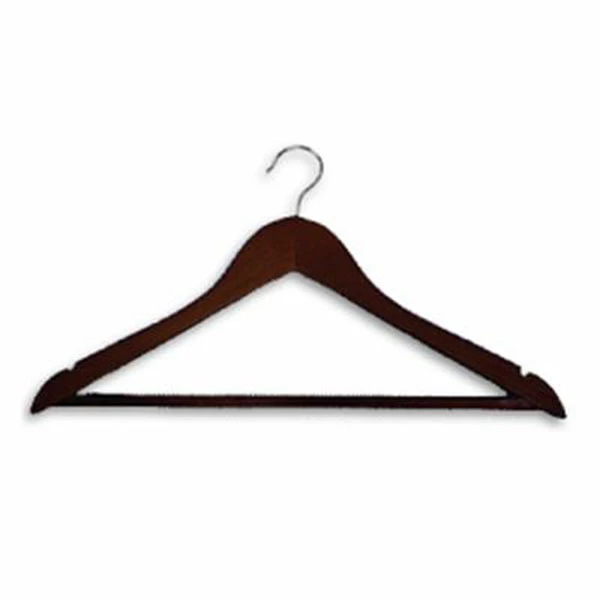 Hotel wooden coat hanger in Dark Wood with chrome standard hook and wooden trouser bar. Luxurious ‘wishbone’ construction. Standard hook in chrome metalwork.