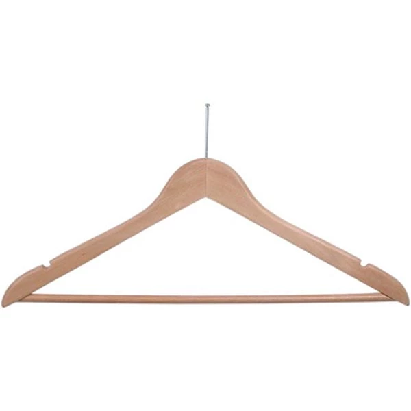 Solid Wood hotel coat hanger with non-slip trouser bar and garment hooks. Steel security stem. Hard wearing and attractive light wood.