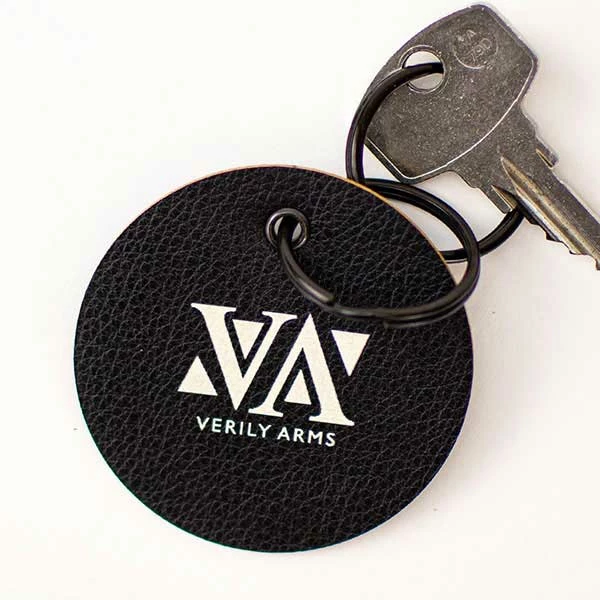 A stylish black leather effect key tag made from a leather style material, which is ideal for any establishment. Round 60mm.