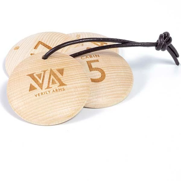 A modern natural hard wood key tag in a simple 60mm round disc shape with a smooth finish. Can be personalused to great effect with your own logo and room numbers.