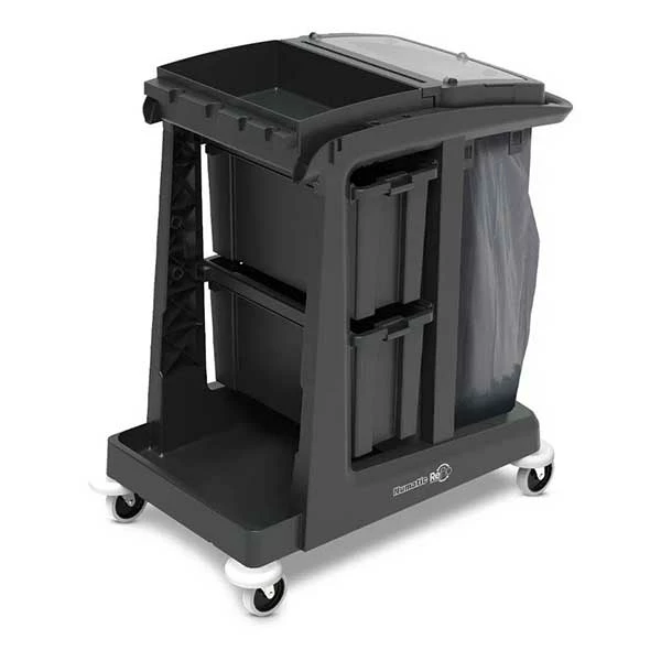 A small, compact and convenient cleaning storage trolley, the Eco-Matic EM2 Cleaning Trolley offers a generous 120L waste bin facility, 2 deep lockable storage drawers and top storage tray for all your cleaning equipment and supplies